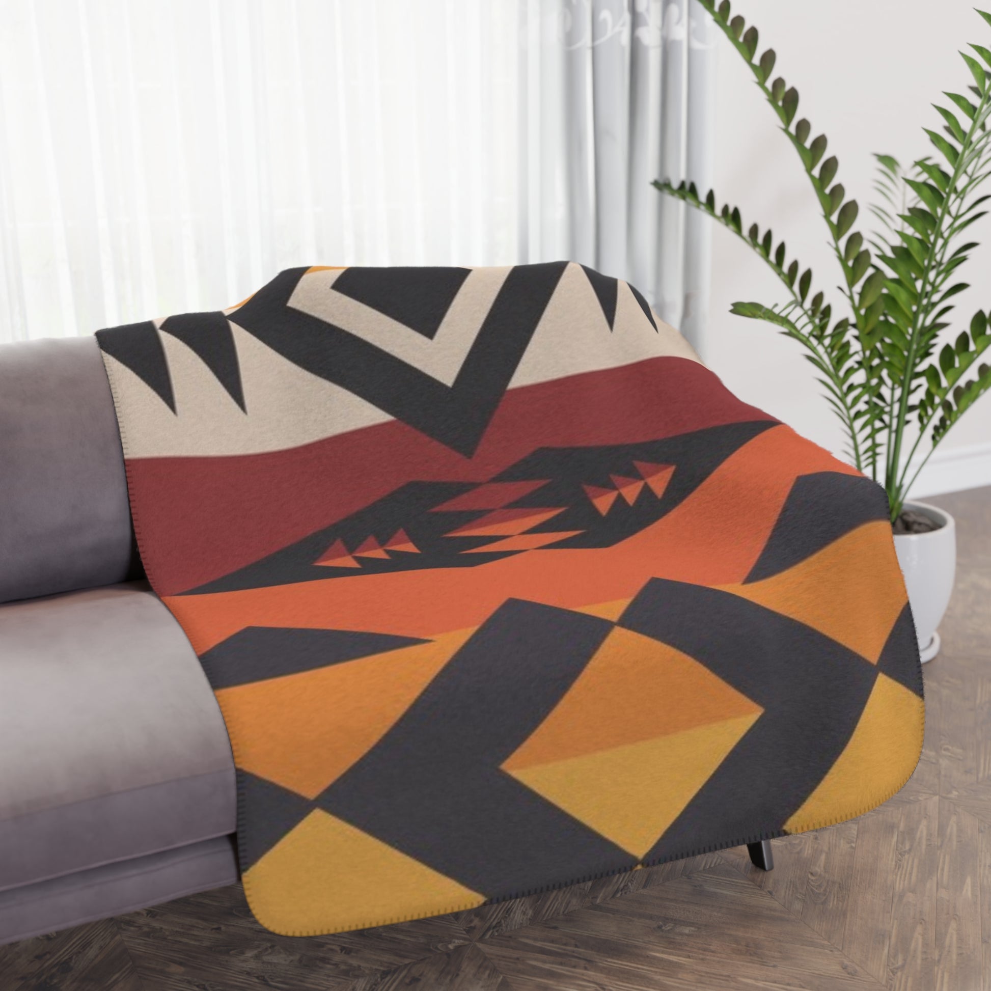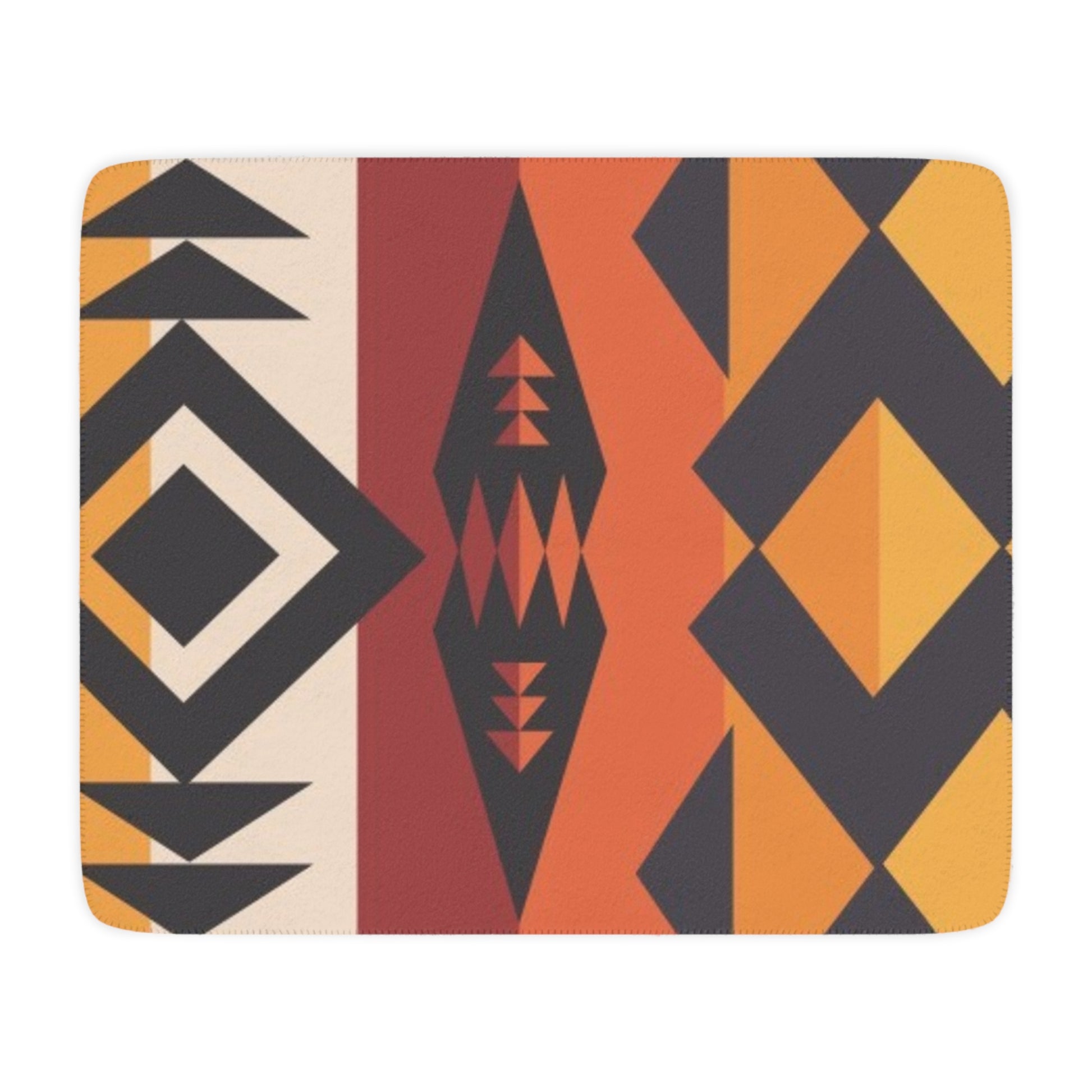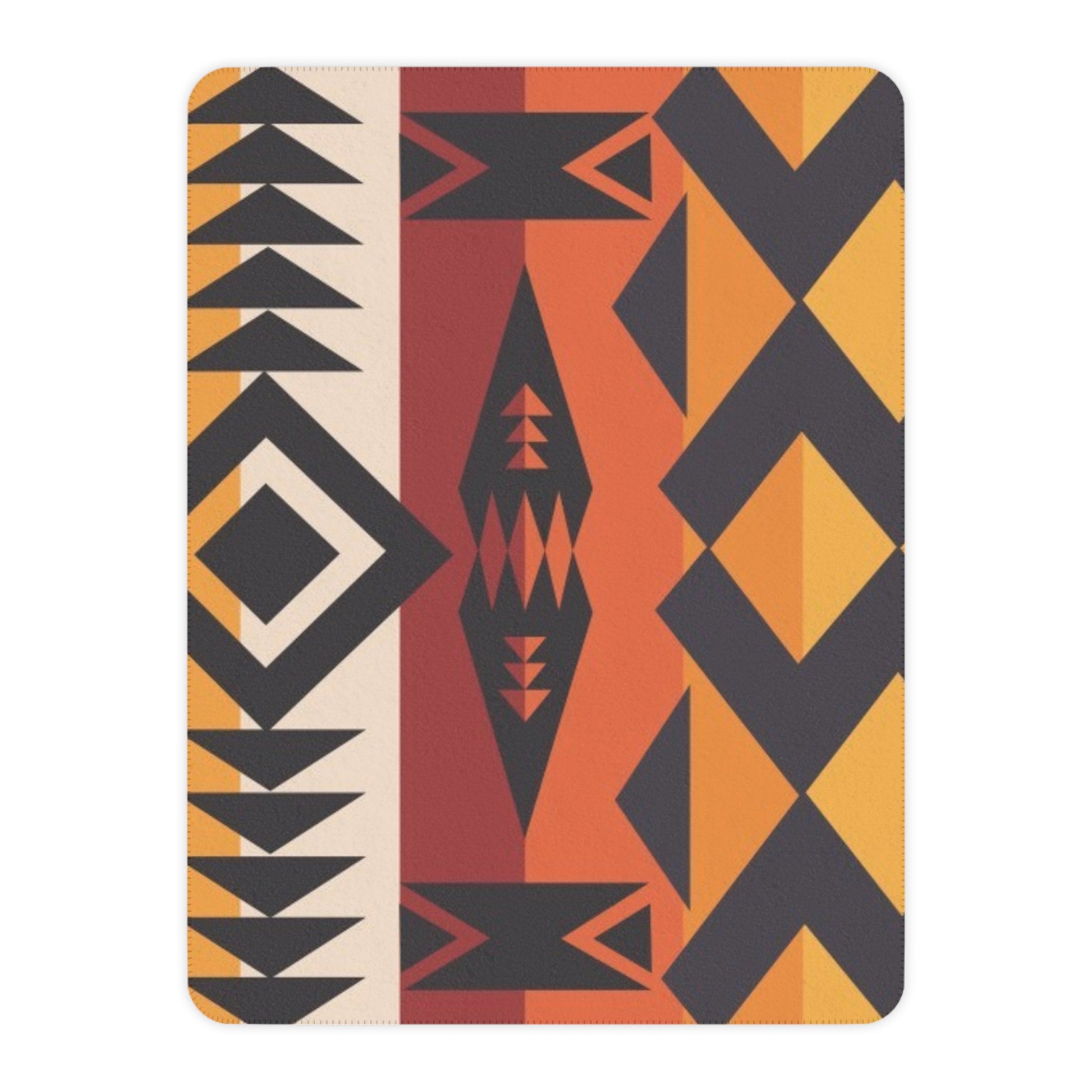 The front showcases a bold geometric print inspired by rusted canyon walls, sun-washed ochre, and charcoal-shadowed cliffs. Flip it over and you’ve got a plush tan sherpa backing — soft enough for slow mornings, cool-night snuggles, trailer naps, and every cozy moment between. Lightweight but insulating, it drapes effortlessly across your sofa, the end of your bed, or the back seat for early-morning hauls and weekend getaways.